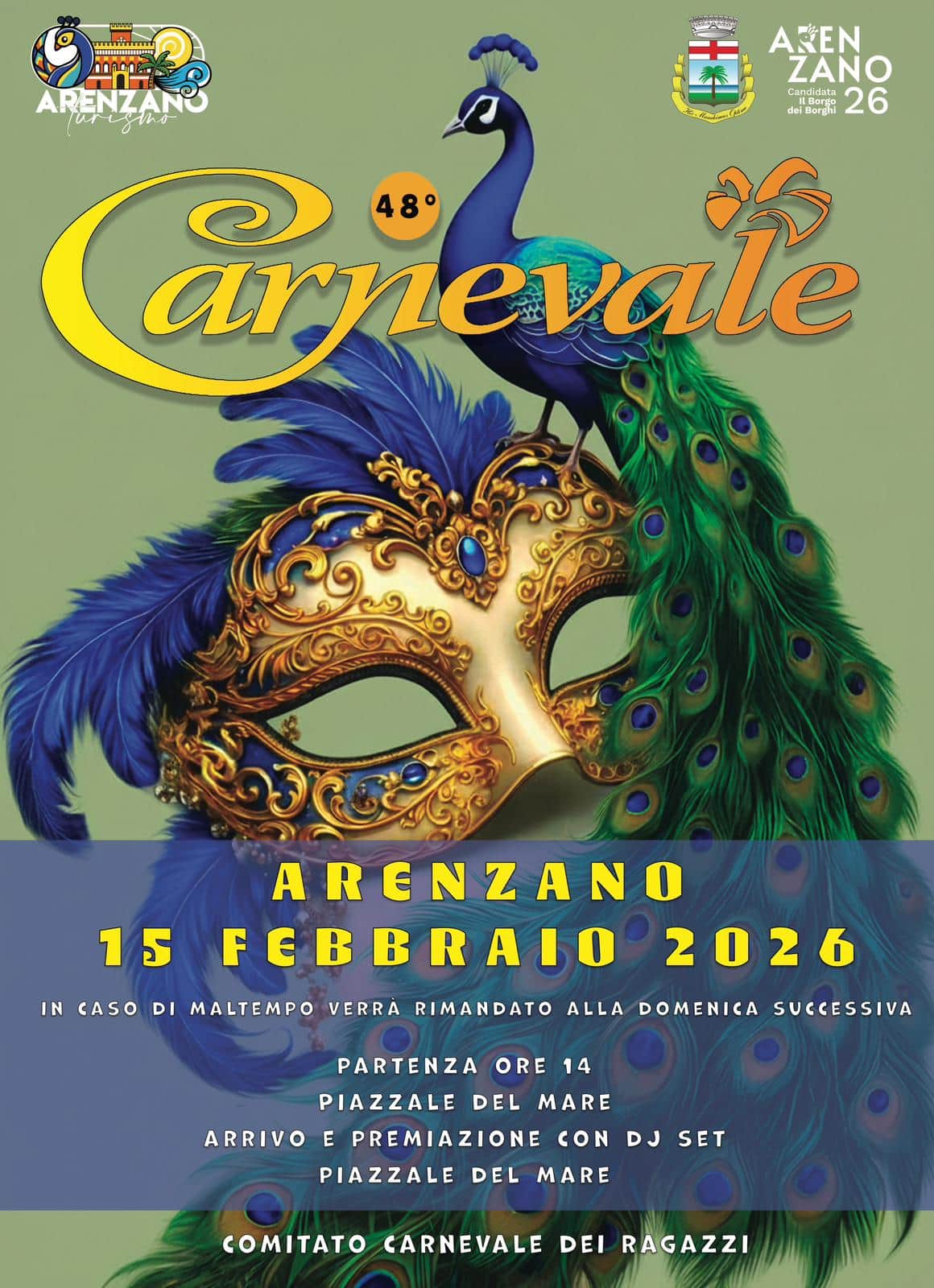 In caso di maltempo l'evento sarà rinviato a domenica 22 febbraio 2026 e verrà comunicato su questo sito e sui social ufficiali di Arenzano Turismo.