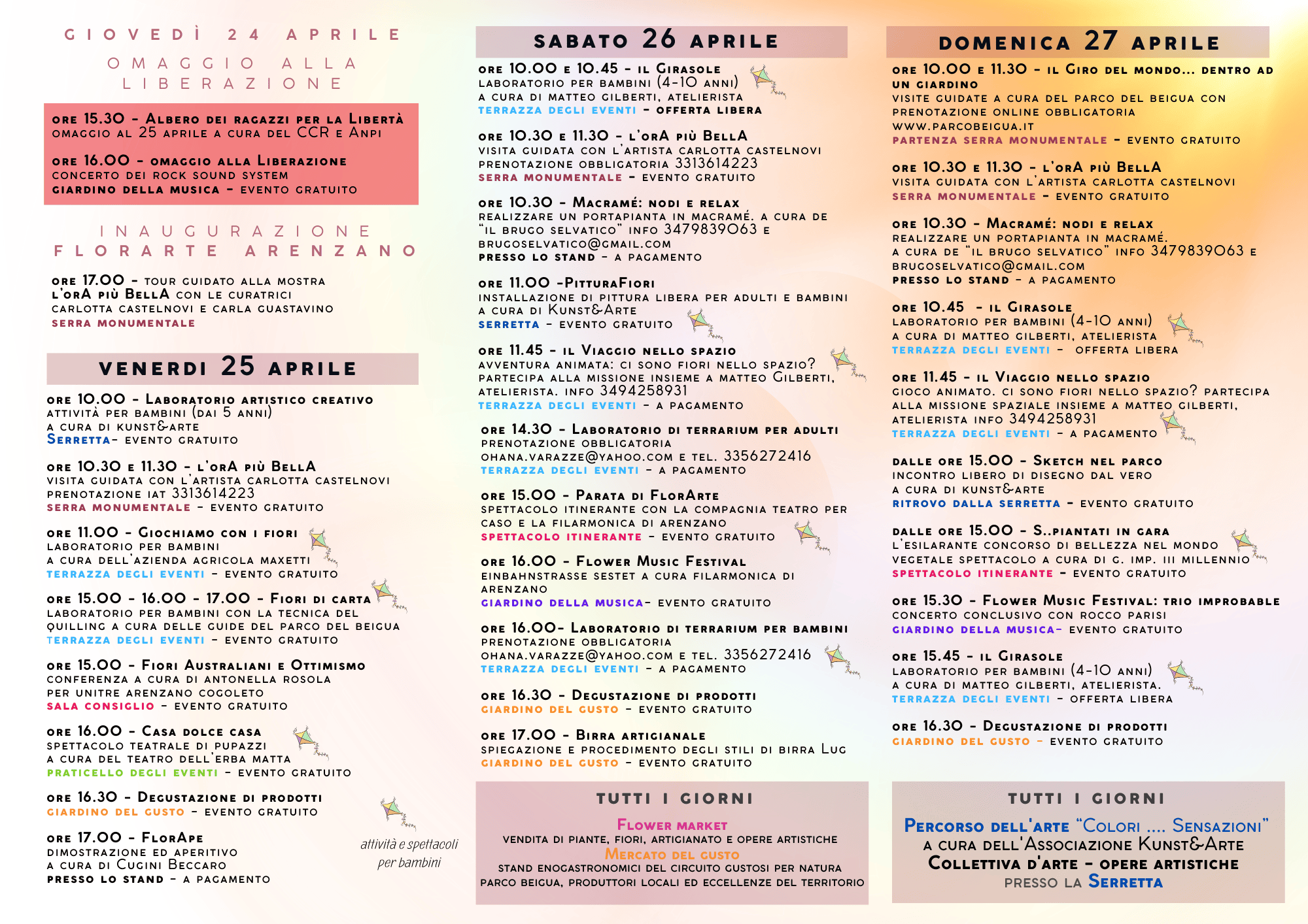 Tre giorni in cui si susseguono attività ed eventi: laboratori dedicati all’arte e ai fiori per bambini e adulti, il Flower Music Festival con cortei di musici e trampolieri, ritmi brasiliani e la banda, conferenze, il Percorso dell’Arte, la mostra fotografica presso il Centro Polivalente Gino Strada, lo spettacolo del Teatrino dell’Erba Matta ed infine degustazioni e visite guidate con l’artista.