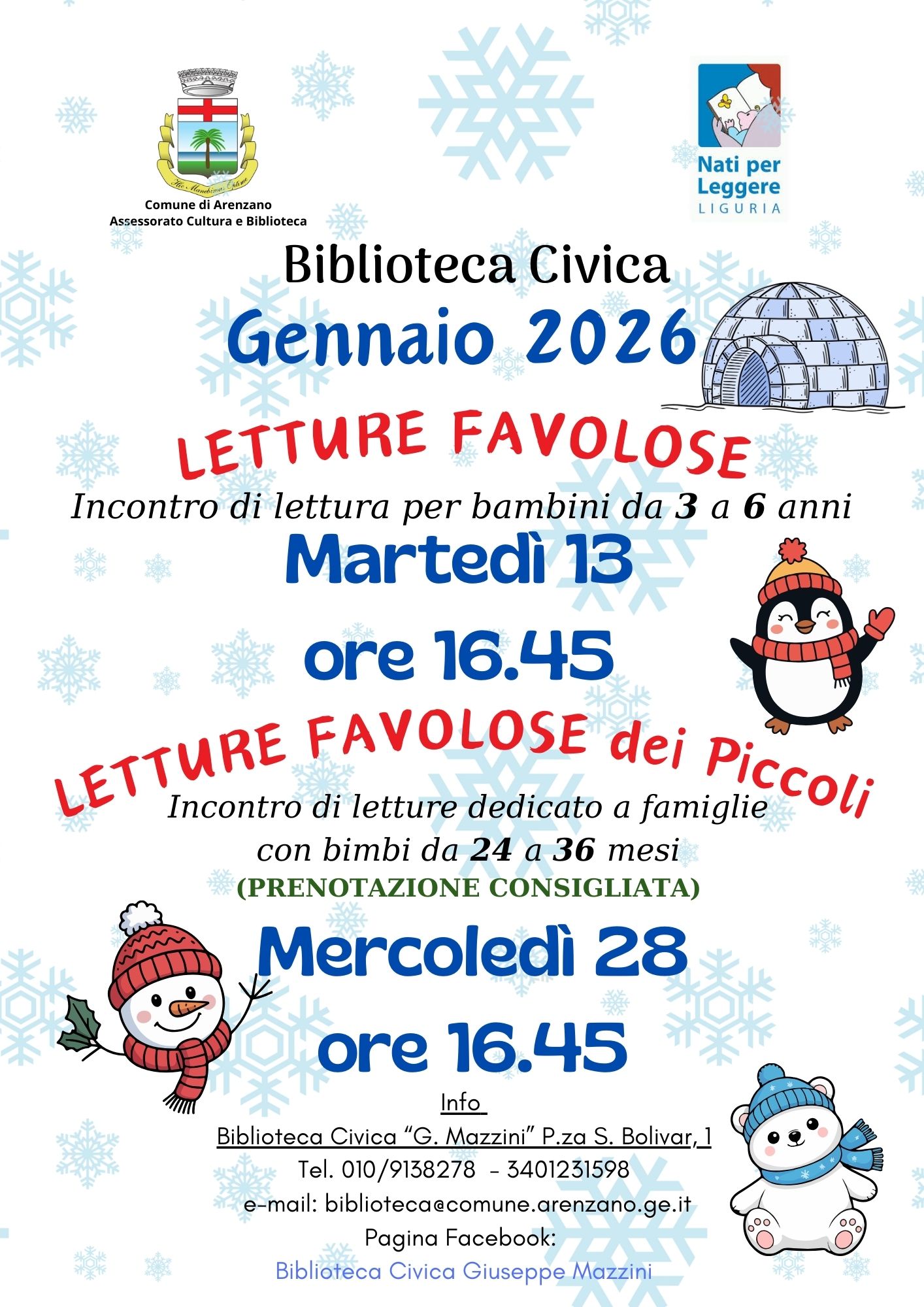 La Biblioteca Civica di Arenzano "G. Mazzini" propone incontri di letture per bambini da 3 a 6 anni.
