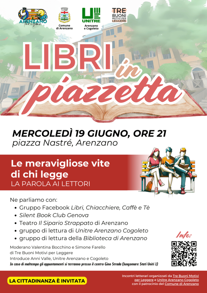 Ma prima la parola va ai lettori: si parte il 19 giugno (save the date!) dove a ritrovarsi in piazzetta saranno i moderatori del gruppo Facebook Libri Chiacchiere Caffé e Té, i membri del Silent Book Club di Genova, dei gruppi di lettura di Unitre e della Biblioteca di Arenzano e il Sipario Strappato. Ognuno dei partecipanti ha trovato un modo originale per promuovere la lettura: insieme scopriremo quale!