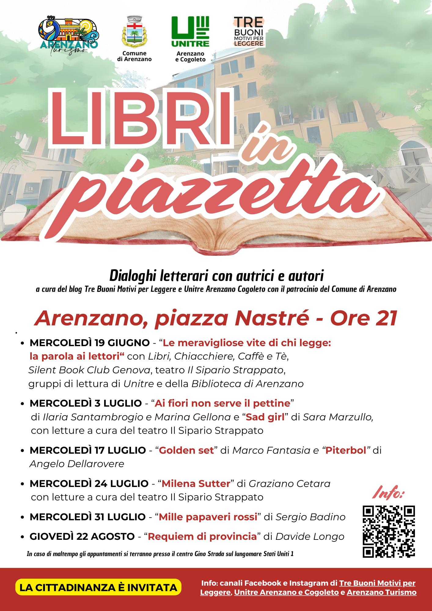 Ad Arenzano arriva una nuova rassegna letteraria per l'estate: si chiama "Libri in piazzetta" e sono sei appuntamenti con autrici e autori nella splendida cornice di piazza Nastré, organizzati dal blog Tre buoni motivi per leggere e da Unitre Arenzano e Cogoleto con il patrocinio del Comune di Arenzano, sulla scia della rassegna “Asimmetrie” che ha riscosso grande successo quest’inverno.